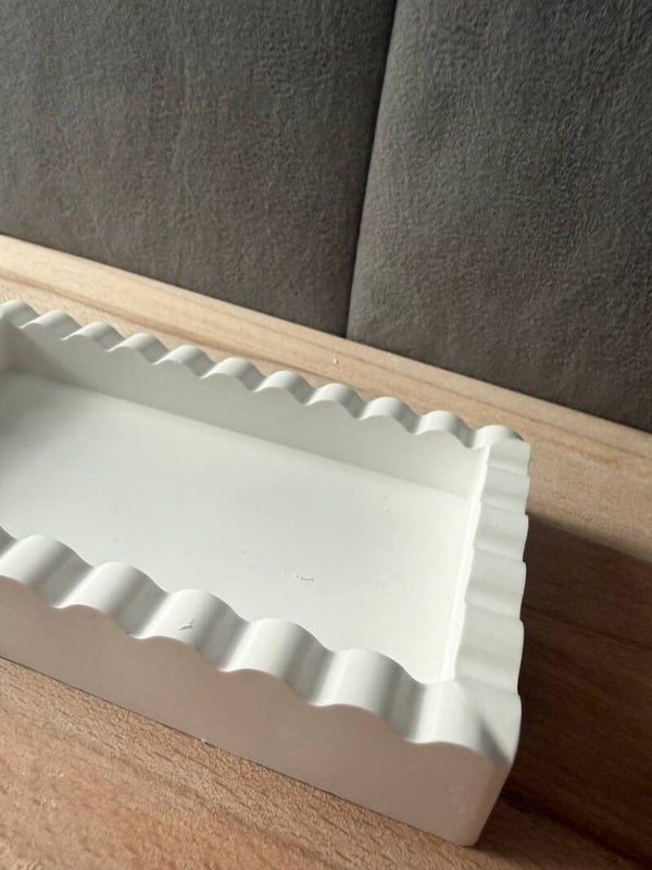 Dieses schlichte, aber charmante rechteckige Tablett besticht durch seinen zarten, wellenförmigen Rand – wie eine sanfte Rüsche oder eine Wolkenkante, die dem minimalistischen Design sofort eine romantische, feminine Note verleiht.